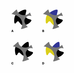 Contour and Surface Interpolation. (A) Both contour and surface interpolation processes contribute to perceived unity of the three black regions behind the gray occluder. (B) Contour interpolation alone. (C) Surface interpolation alone. (D) Both contour and surface interpolation have been disrupted, causing the blue, yellow, and black regions to appear as three separate objects.