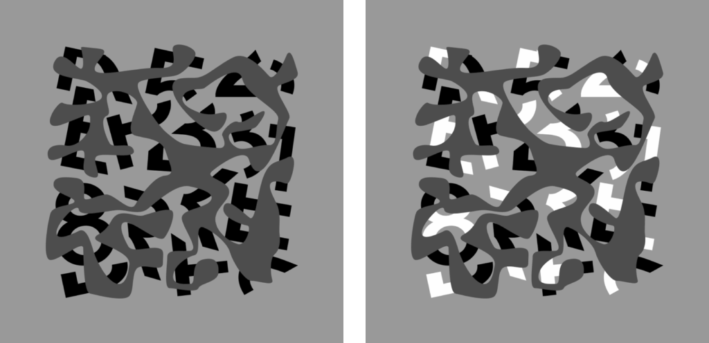 Graphical examples of contour relatability, which expresses the underlying geometry of contour interpolation in both amodal and modal completion. Top Row: Relatable edges produce amodal completion of the visible black regions (left column), and for the same physically-specified edges, illusory contours in the right column. Bottom Row: Disruption of contour relatability leads to perception of separate fragments (left) and the absence of illusory contours (right).
